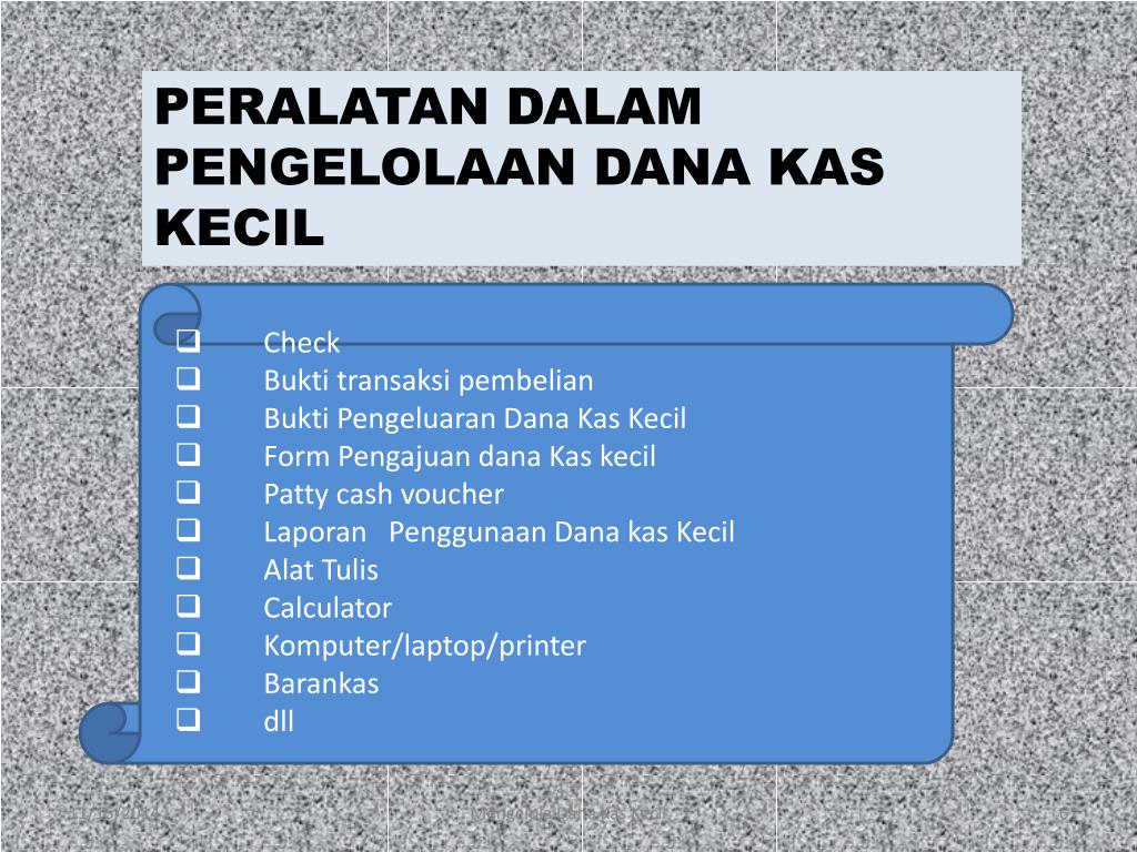 Contoh petty cash kas kecil adalah dana pengeluaran rutin dan relatif kecil jumlahnya. Staf administrasi kantor atau sekretaris membuat surat permohonan pengisian dana kas kecil (mengisi formulir pengajuan dana . Contoh kasus dan laporan petty cash. Sistem pengelolaan kas kecil anugerah . Fungsinya adalah untuk pengajuan pengisian .